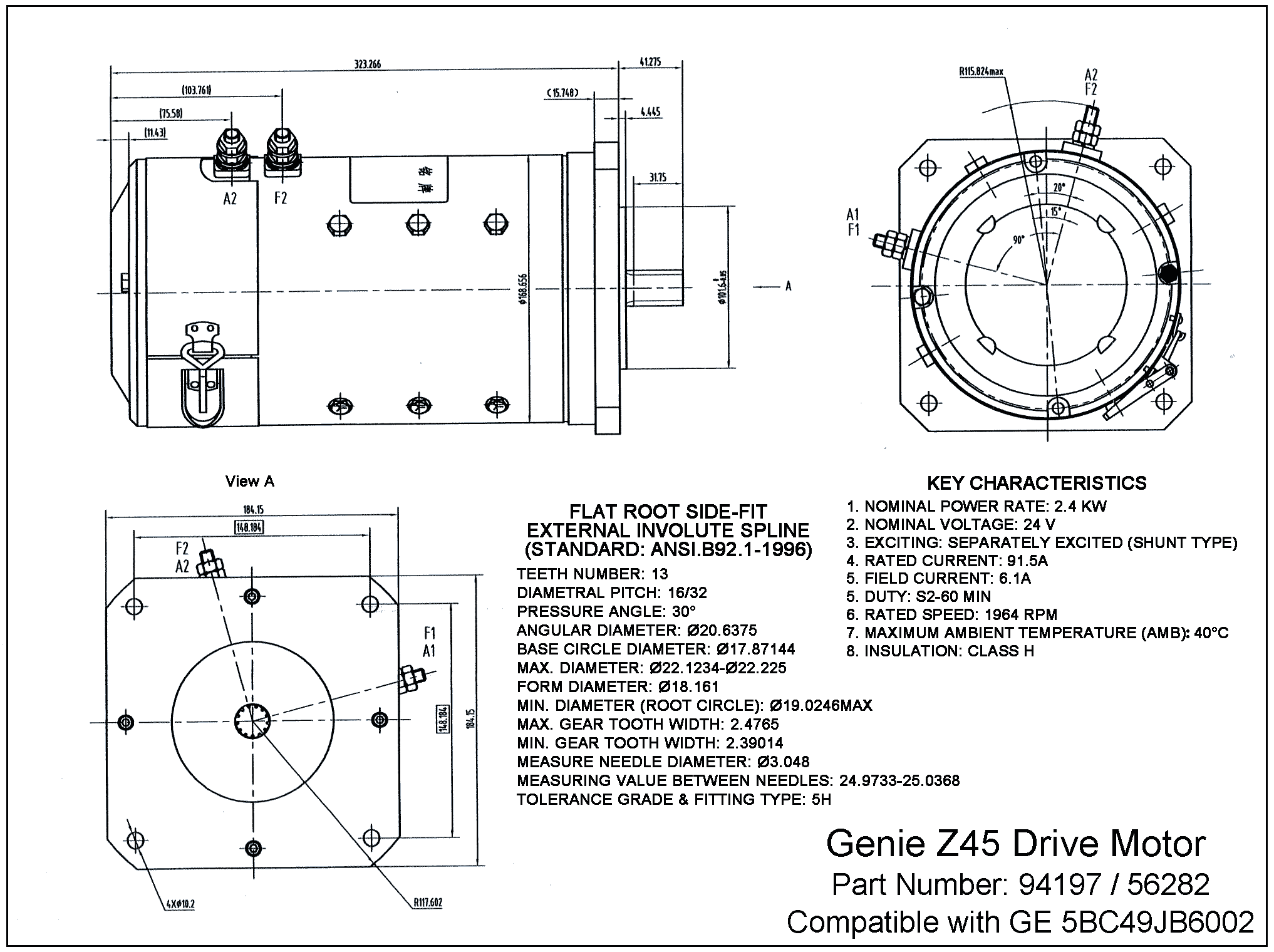 24V / 2.4kW DC SepEx MotorCompatible with GE 5BC49JB6002GE Z45 articulated boom lifts drive motor, part number 94197 / 56282 / 1263610Rated for 24V / 2.4kW, this shunt type motor is the drive motor for GENIE Z45/25 and Z45/25J articulated boom lifts. Specifications:
